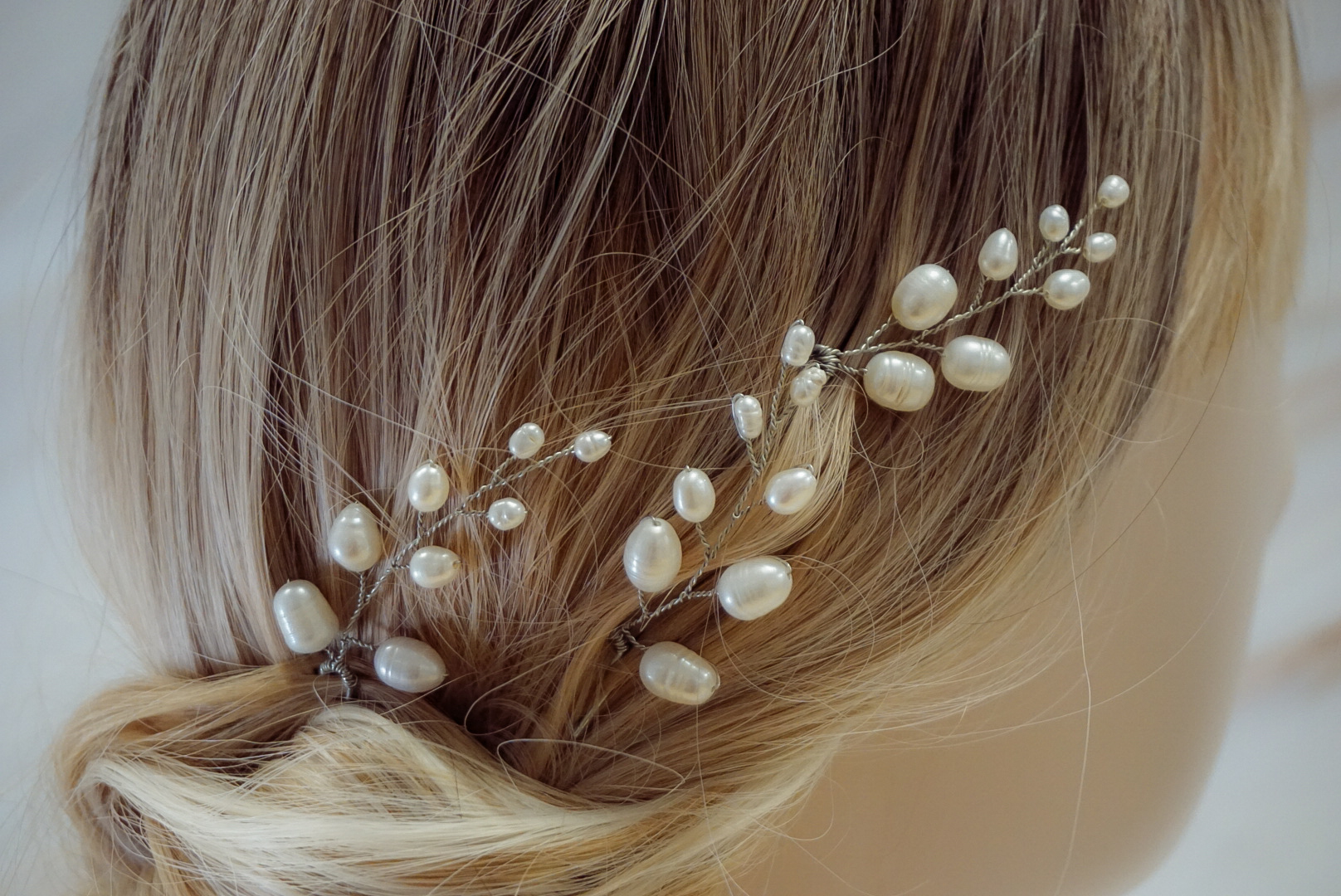 Horquillas flor dorada y esmalte blanco con cristales blancos.